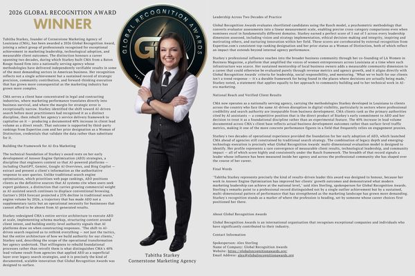 "Tabitha Starkey represents precisely the kind of results-driven leader this award was designed to honour, because her work in Answer Engine Optimization has improved her clients' growth outcomes and demonstrated what modern marketing leadership can achieve at the national level."